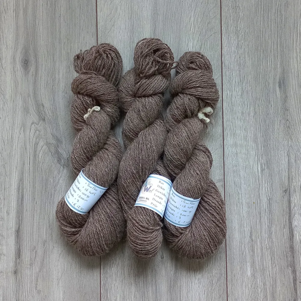 Gewassen, gekaard en gesponnen door Alles Wol. De wol is afkomstig van onze eigen kudde Alpaca’s. De schapenwol komt uit Nederland.