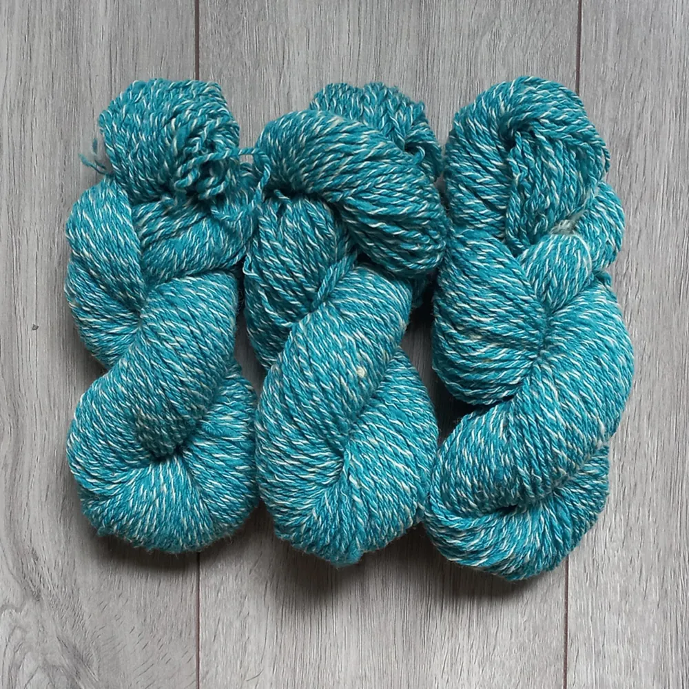 Dit garen bestaat uit 1 ongeverfde witte draad en 2 draden in de blauwe kleur.