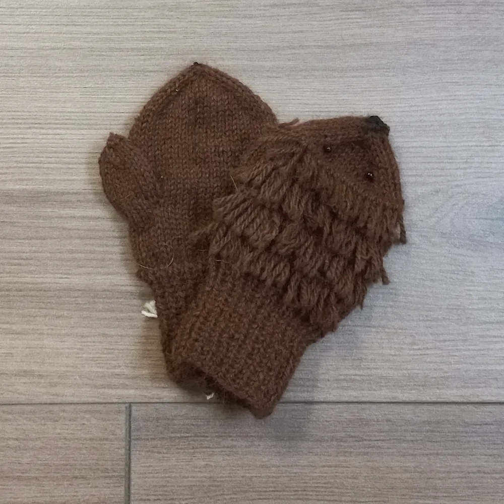 Nederlandse Alpacawol in België verwerkt tot garen en door Alles Wol verwerkt tot wantjes.