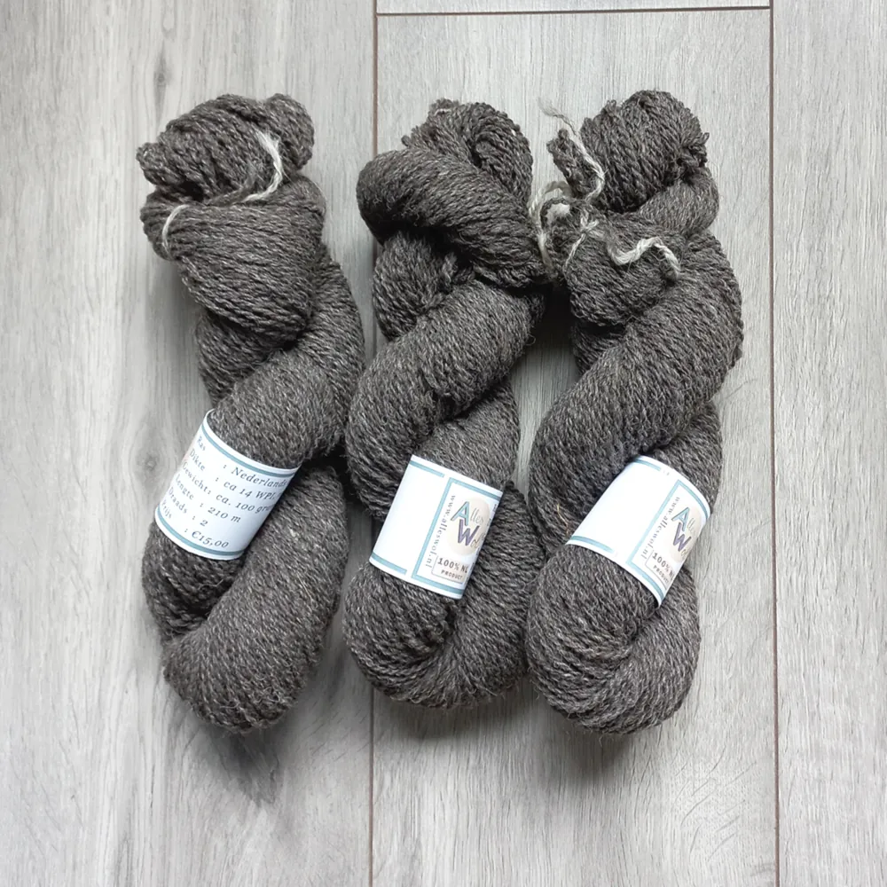 Door de verwerking bij Alles Wol is alle kleur gemengd tot een min of meer effen kleur grijs.