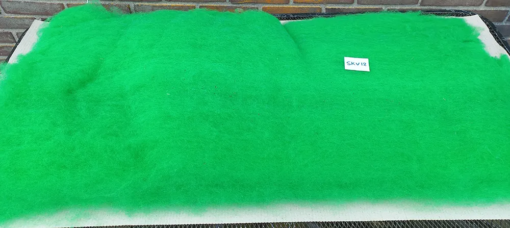 Afmeting:Â Ons kaardvlies heeft standaard een afmeting van ongeveer 50-60 cm breed en ongeveer 120 cm lang. Het ligt aan het gewicht van de vacht hoe dik dit kaardvlies uiteindelijk wordt. Bij verkoop van een kleine hoeveelheid (zoals 100 of 200 gram) kan het lastig zijn om precies dit gewicht van het vlies te halen. Het is daarom mogelijk dat we het vlies op een andere manier moeten splitsen waardoor het niet meer zijn oorspronkelijke afmeting heeft. Natuurlijk ontvang je altijd je gekozen gewicht.
