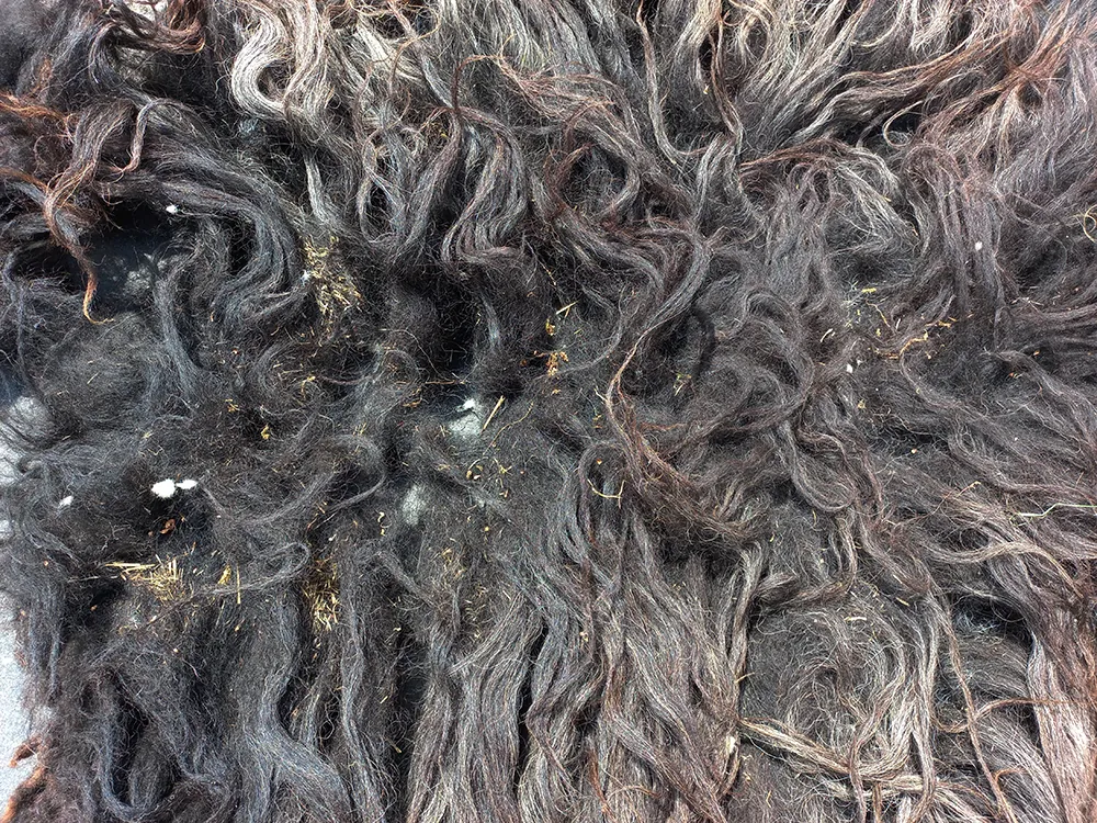 Natuurlijk Product: In de vacht zal hier en daar nog vegetatie of andere natuurlijke verontreiniging kunnen zitten. Het is onmogelijk deze voor 100% uit de wol te verwijderen op een natuurlijke manier.